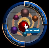 3D Ball Menu App. 3D Ball Menu App. download İşte mükemmel bir menü örneği. Sayfanız için çok ideal. Ortada bir top duruyor. Üstüne fare ile gelince toplar açılıyor ve menulerin özelliğini açıklıyor.