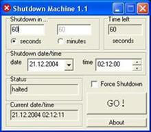 Shutdown Machine Shutdown Machine indir Bilgisayarınızı istediğiniz tarih ve/veya saatte kapatabilmenizi sağlayan ücretsiz ve küçük boyutlu bir program. Not:Programı çalıştırıp zaman belirledikten sonra açık tutmanız gerekiyor. Kendisi tray’de çalışmıyor.